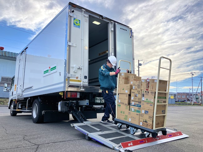 カート(荷物を載せる台車)に商品を乗せて、トラックに詰め込み、店舗へもカートのまま置いてくるだけ!