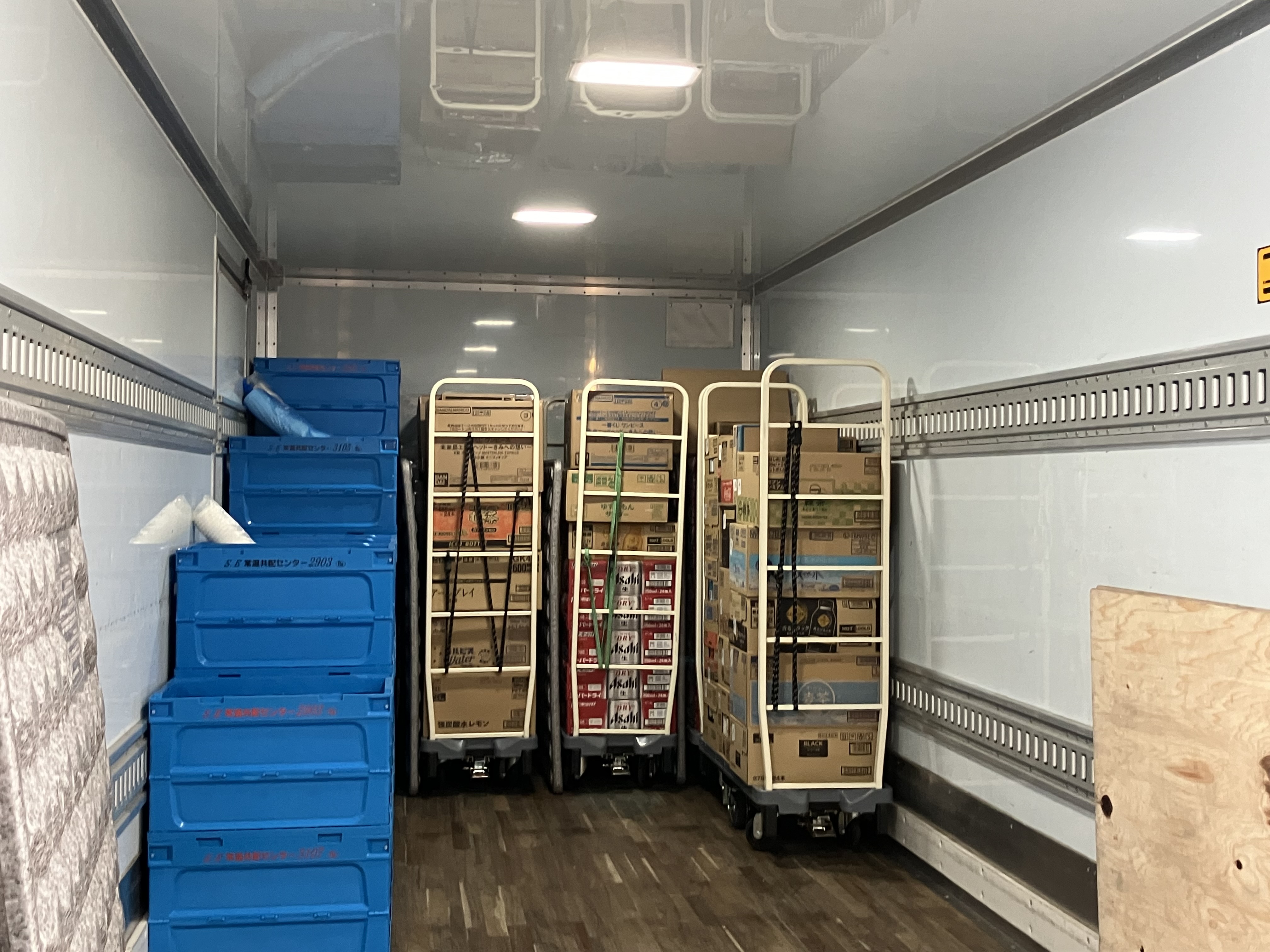 カート(荷物を載せる台車)に商品を乗せて、トラックに詰め込み、店舗へもカートのまま置いてくるだけ!