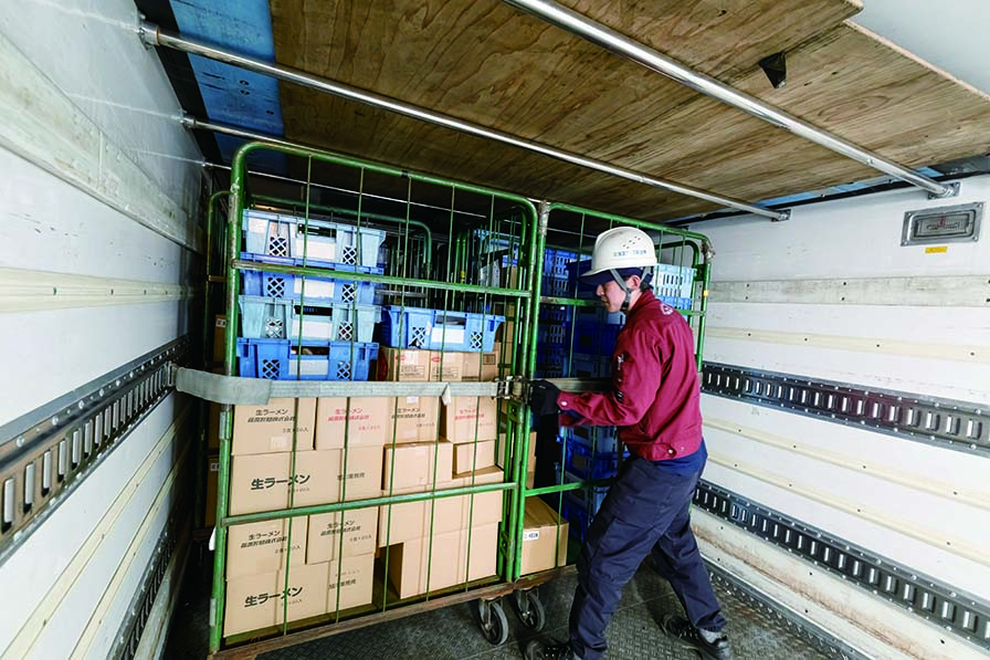 カゴ台車に積まれた商品を積み込み、動かないようにしっかり固定します。
