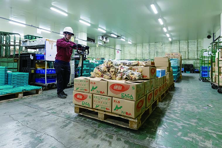 農家やJAなどから受け取った青果は、自社倉庫で配送先ごとに仕分けられ、カゴ台車やパレットに積んだ商品をスーパー等の小売店へ届けるのが一連の流れです。