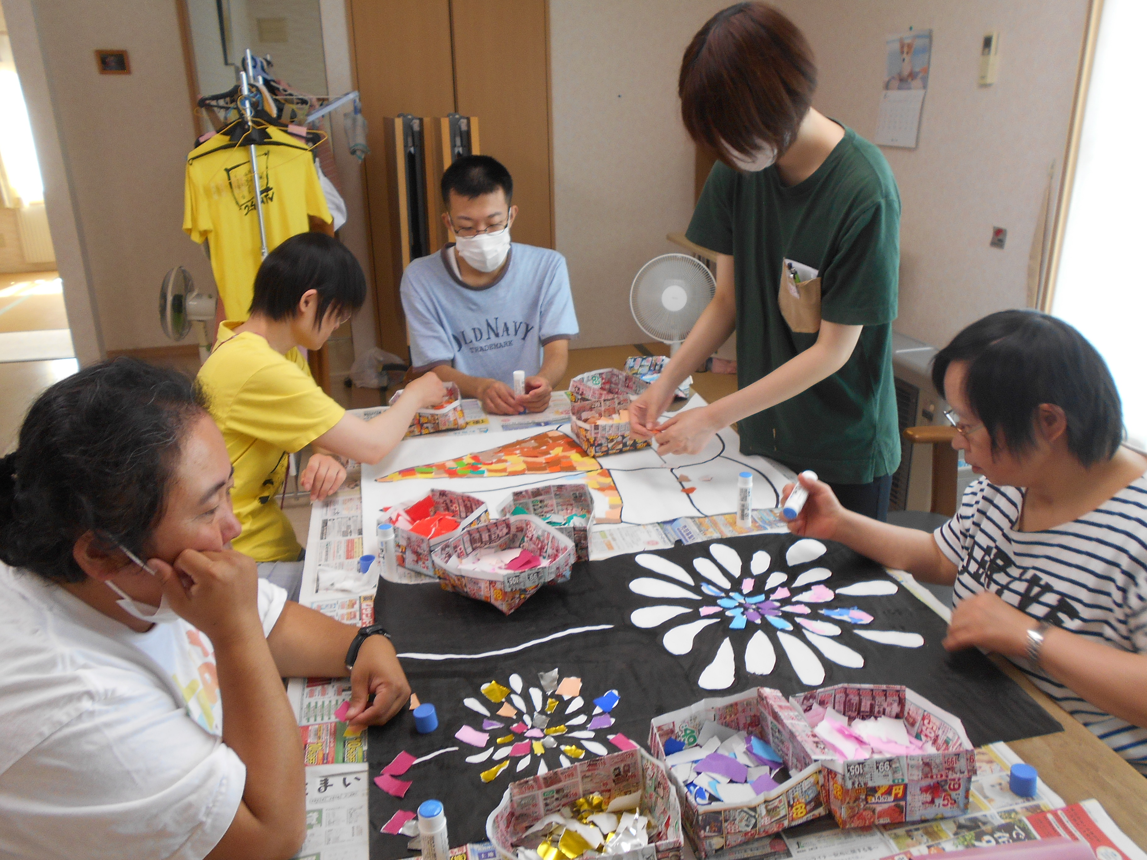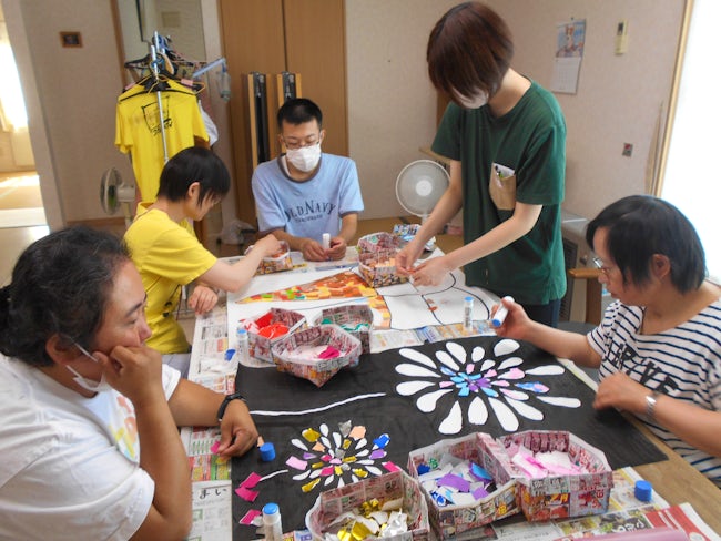 ちぎり絵制作の風景です。利用者さん一人ひとりの個性や想いを大切にしています。完成までの時間も大切な支援のひとつ。そばで寄り添い、できた喜びや笑顔を一緒に分かち合える仕事です。