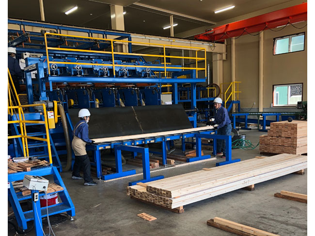 パレットや梱包に使うための木材を、原木から製材しています。原木から極力廃棄部分が出ないよう、効率的な製材・加工を行っています。加工後の木材は人の手で運べる大きさなので、女性・シニアも活躍しています。