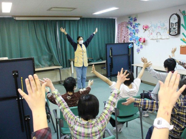 日中は健康管理、体力維持の為の簡単な体操やレクリエーションの他、書道・絵画等の創作活動なども行っています。また作業生活班では内職的作業を中心に、空き缶つぶし・シール貼り・梱包作業等も行っています。