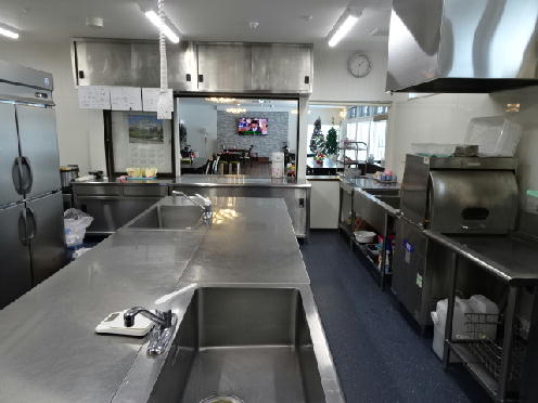 厨房内観。冷暖房エアコン、食洗機、食器乾燥保管庫、スチコン完備しています。