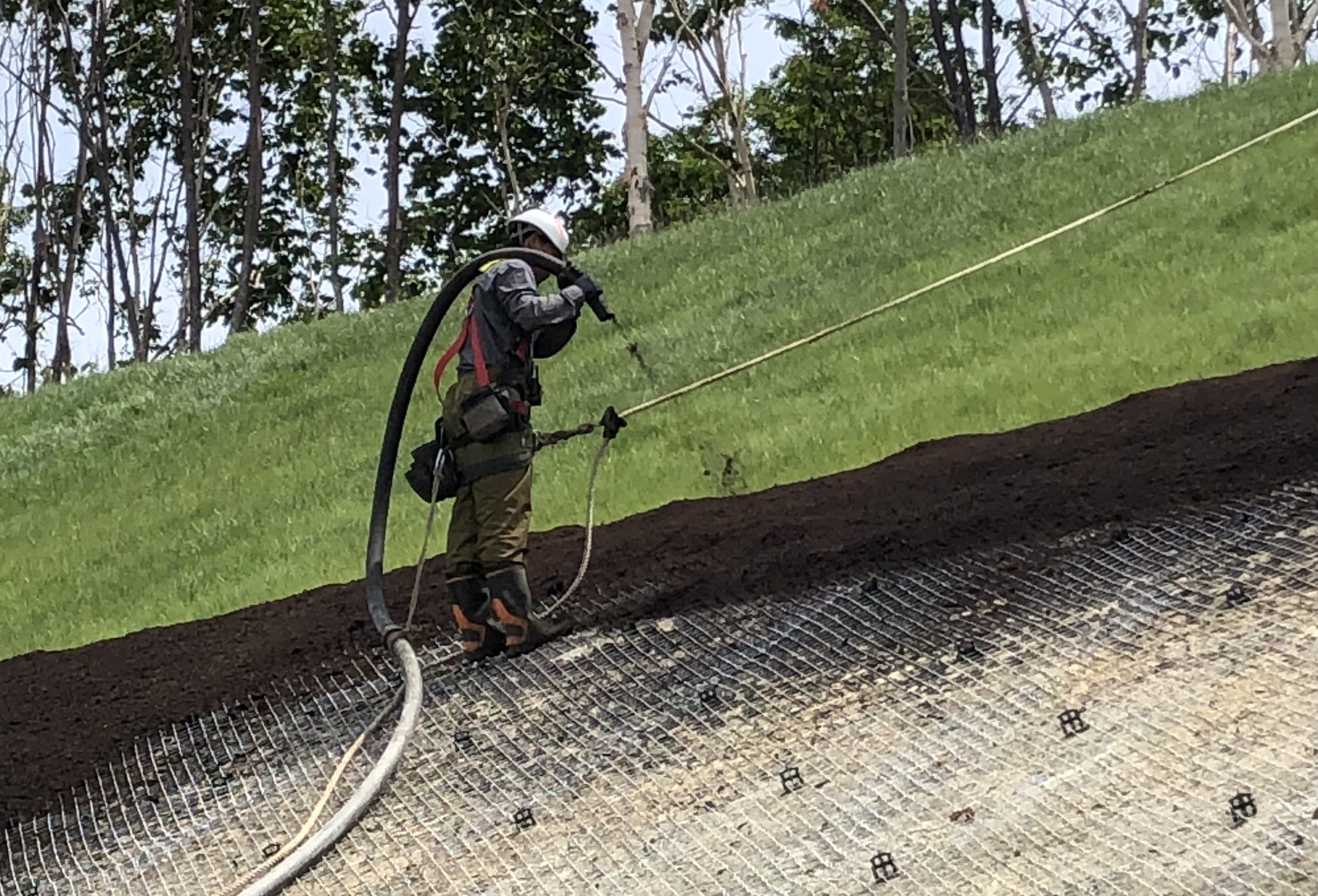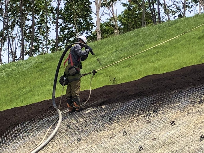 <災害の防止にも一役かってます>工事によって生まれる斜面は、土砂崩れの危険性があります。そこに植物の種や肥料を吹き付け、緑化させることで、自然との共生の実現、崩壊防止などの大切な役割を果たしています。