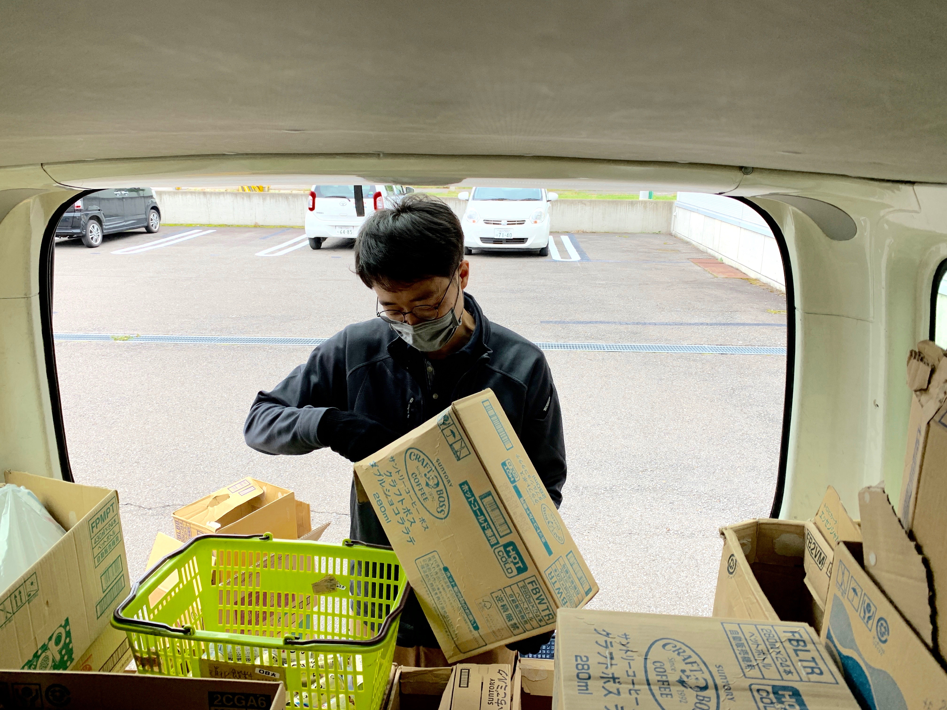 無くなった本数を数えたら、車に戻って商品の入れ替えや補充する商品をカゴに入れるピッキング作業を行います。飲料メーカーからオススメして欲しい商品が来たりなど、定期的にラインナップは変わります。