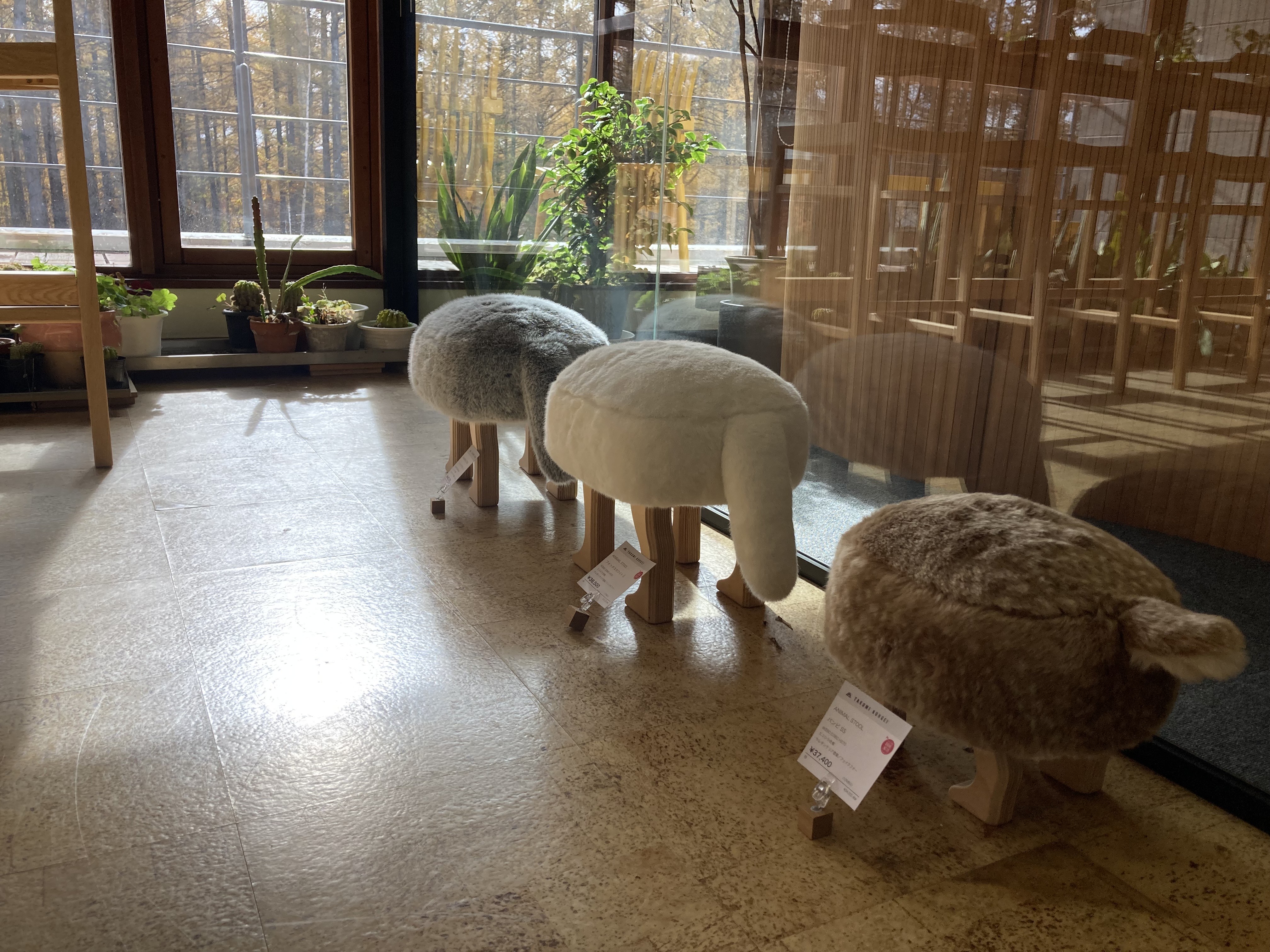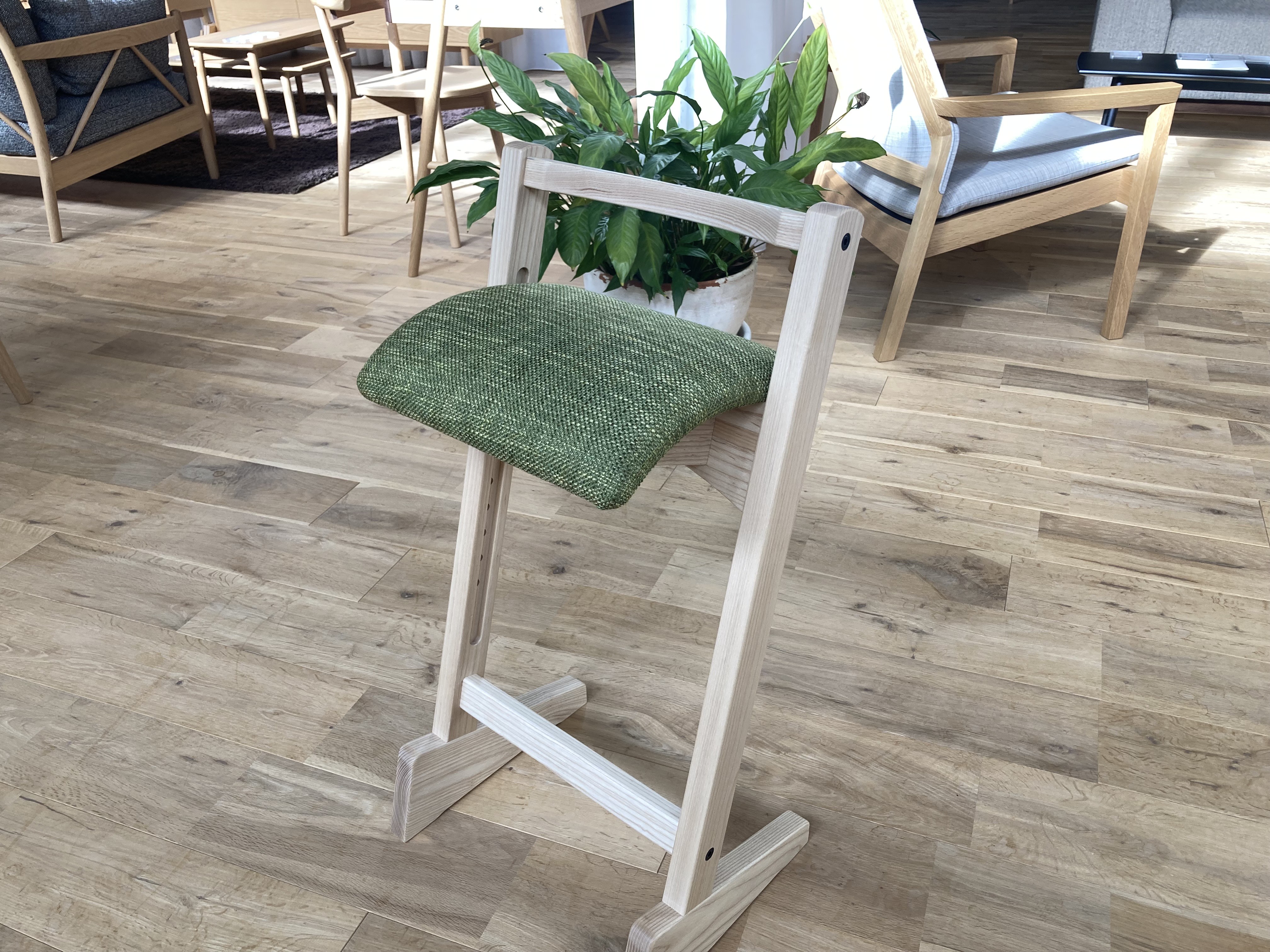 イスはイスでも色・形・座り心地など様々。こちらは座る面が小さいイスです。キッチンで少し腰をかけたい時や髪を乾かす際にぴったりの商品です。このようにお客様の用途に合わせて紹介・提案をしていきます。