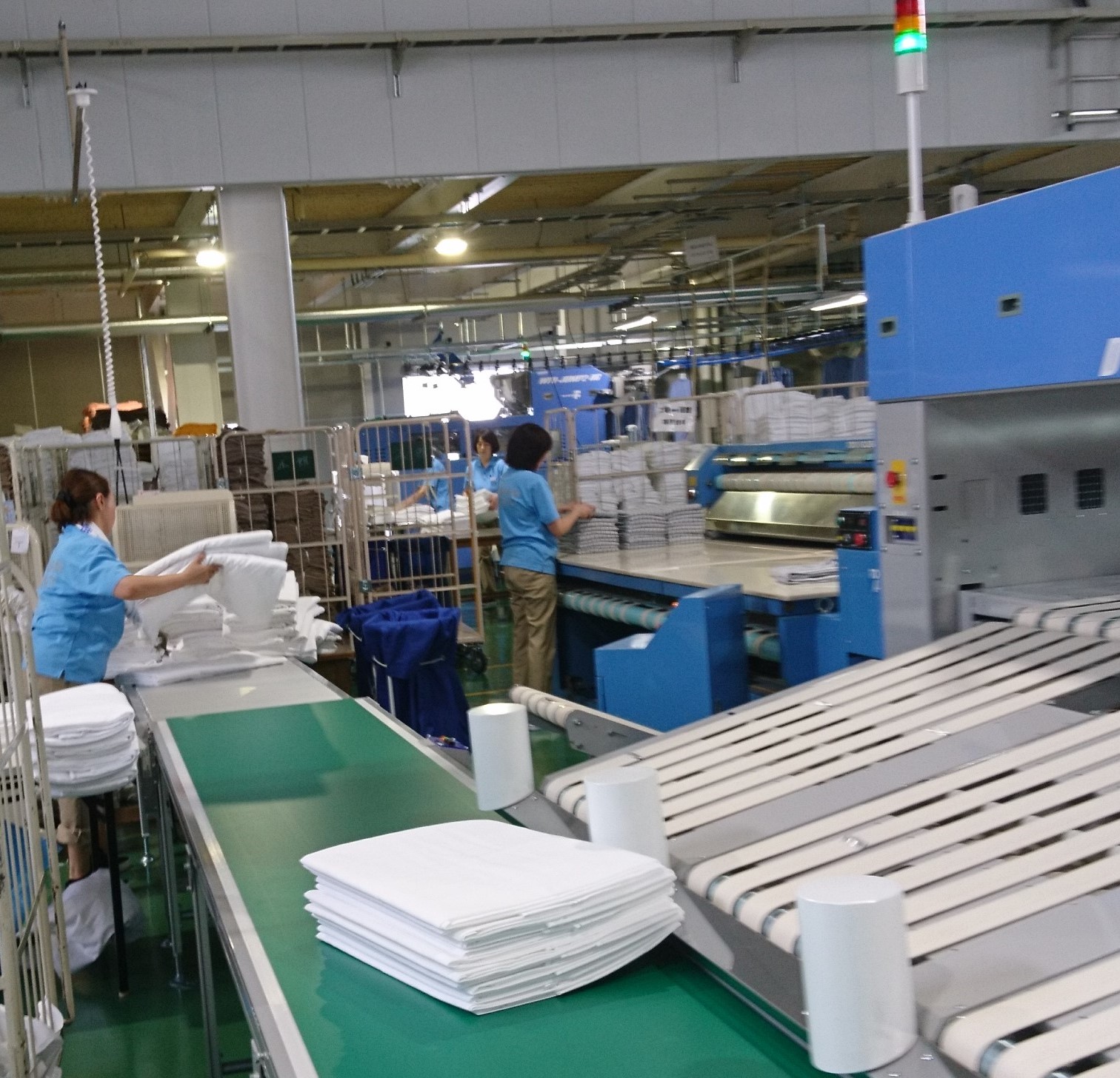 使用済みのシーツやタオルのクリーニング工場での仕上げのお仕事です。