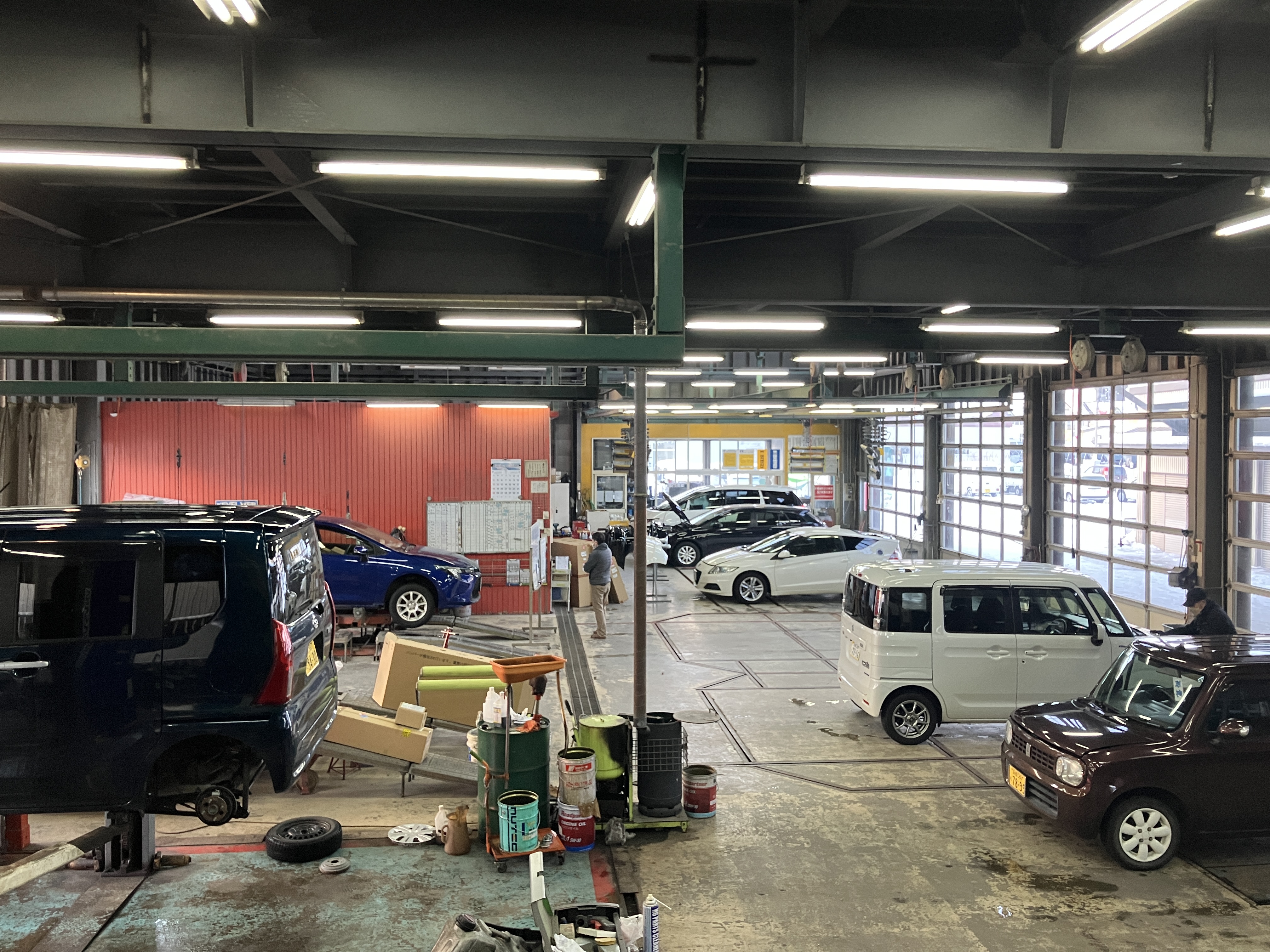 会社敷地内に洗車用倉庫と整備・板金・塗装工場が分かれています。車検、修理・車販売、用品販売など、車に関するあらゆるニーズにお応えできる会社です。