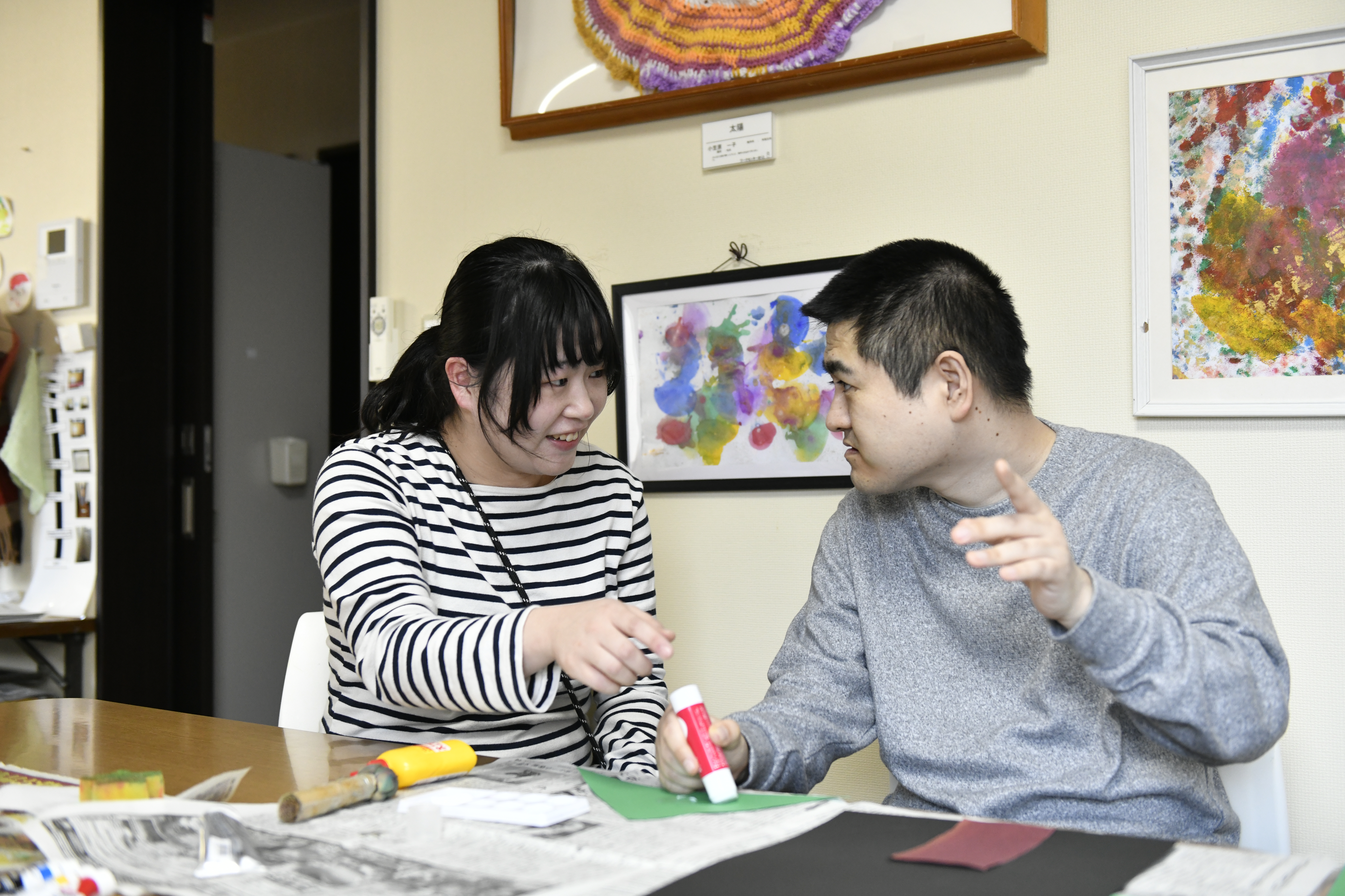 ◇アール・ブリュット...写真は利用者さんのアート作品の一例。近年では特に、利用者さんのアート制作支援や、その他の日中活動のサポートにも注力。日々独創性あふれるアートが生み出されています。