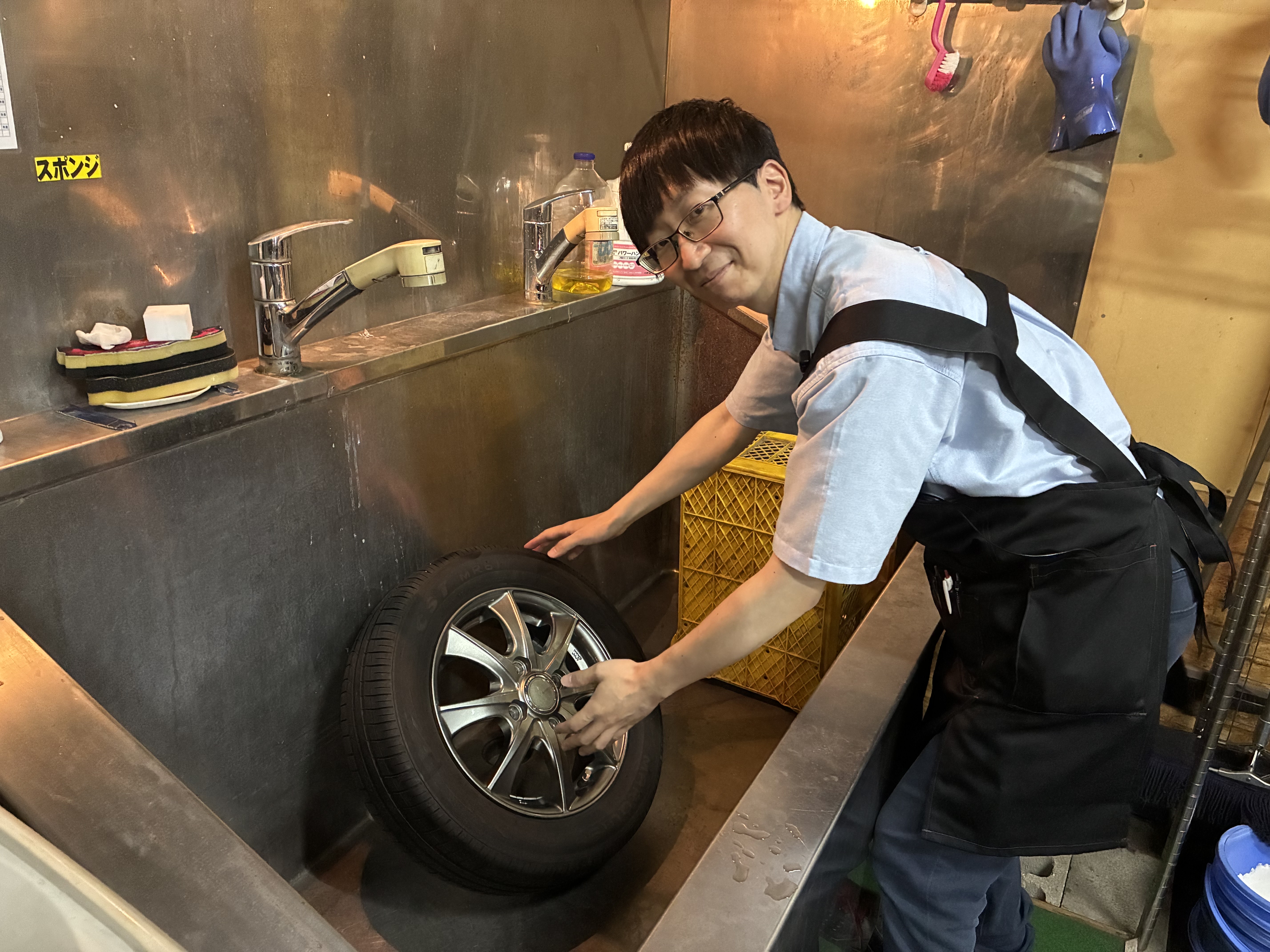 【タイヤ洗い作業風景】店内には他職種のスタッフも在籍。分からない事があったときには、常に聞きやすい環境になっていて、専門的な事は別スタッフが引継ぎ対応(バトンタッチ)も行いますので安心して働けます♪