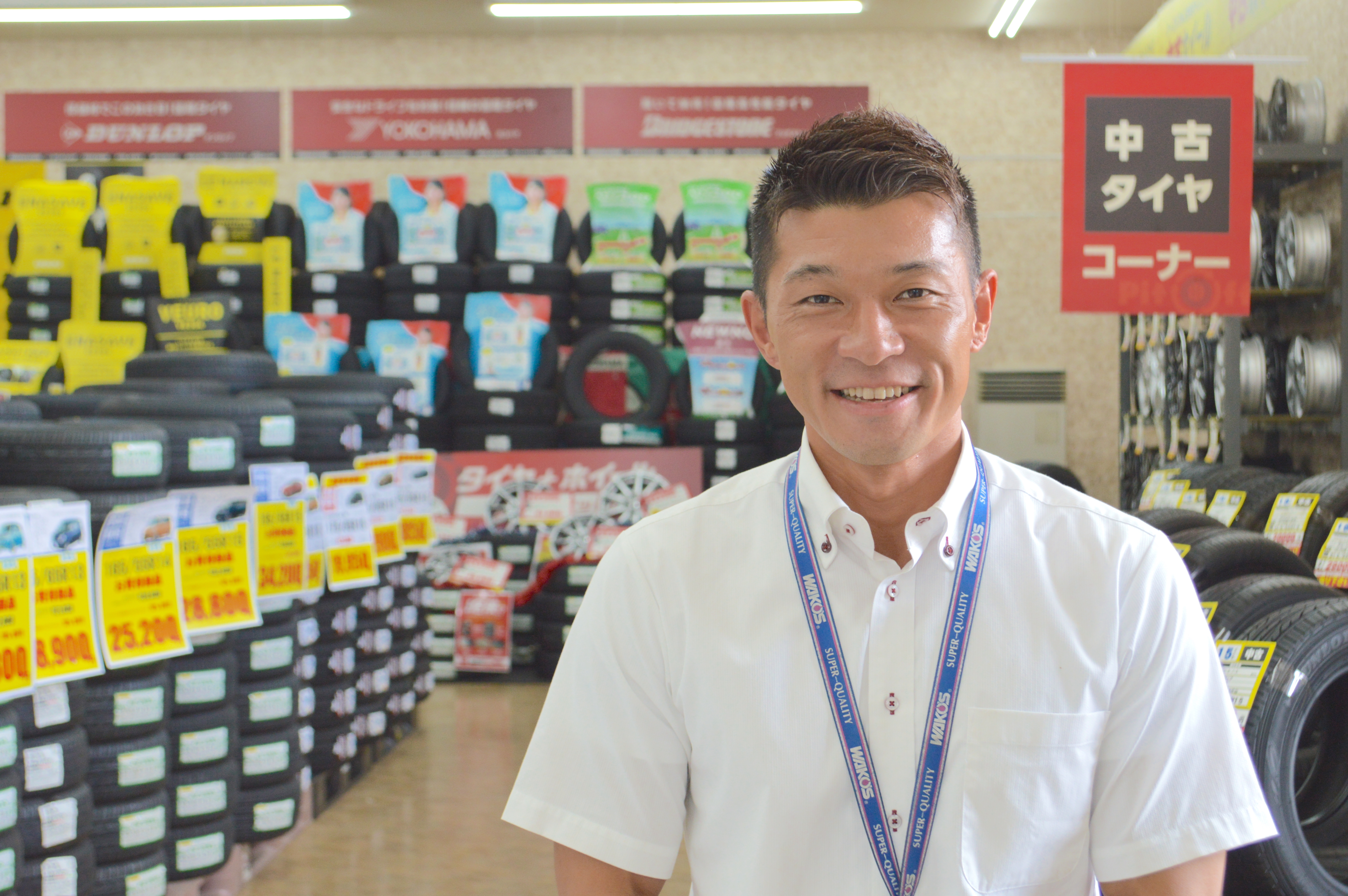 当店はタイヤ・ホイールの販売・交換、車検受付、カー用品、車輌販売を行っているお店です。