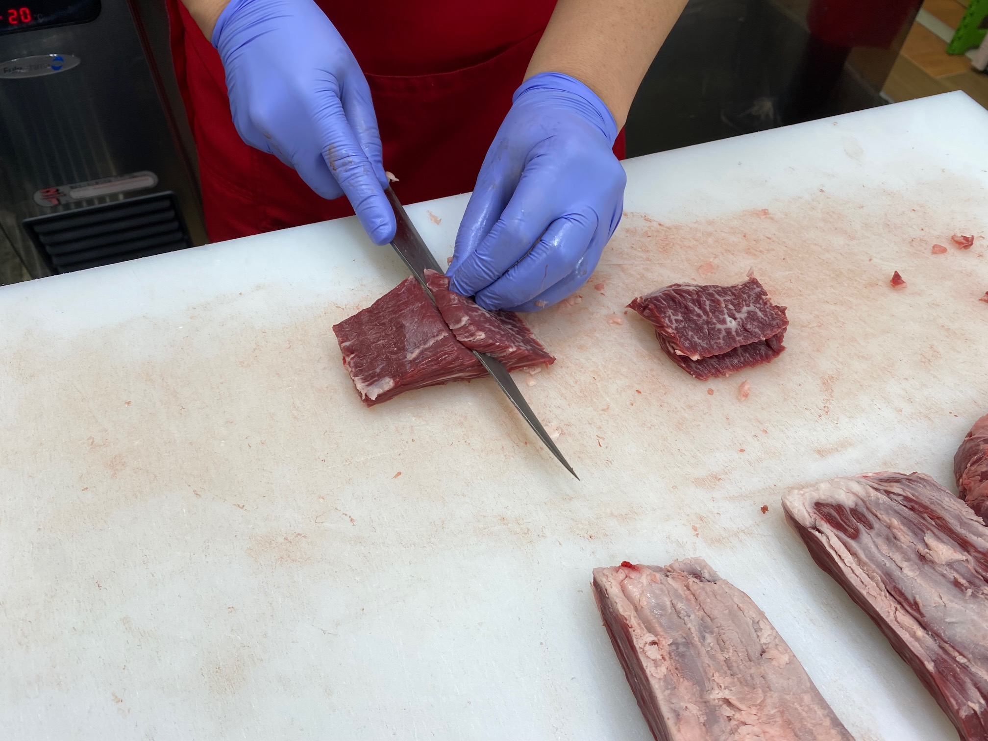 作業は写真の様に、ひと口サイズのお肉をカット、その後真空パック包装をすると言った作業です♪