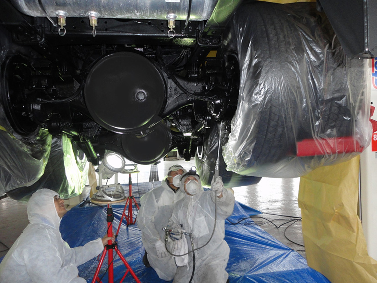 独自のスプレーシステム/60年の実績が生み出した独自の施工方法が、車輌のあらゆる箇所を確実・迅速に防錆施工することができるのは、ポンプや特殊ツールなどの他社が真似出来ない特殊機器を使用して施工しているから