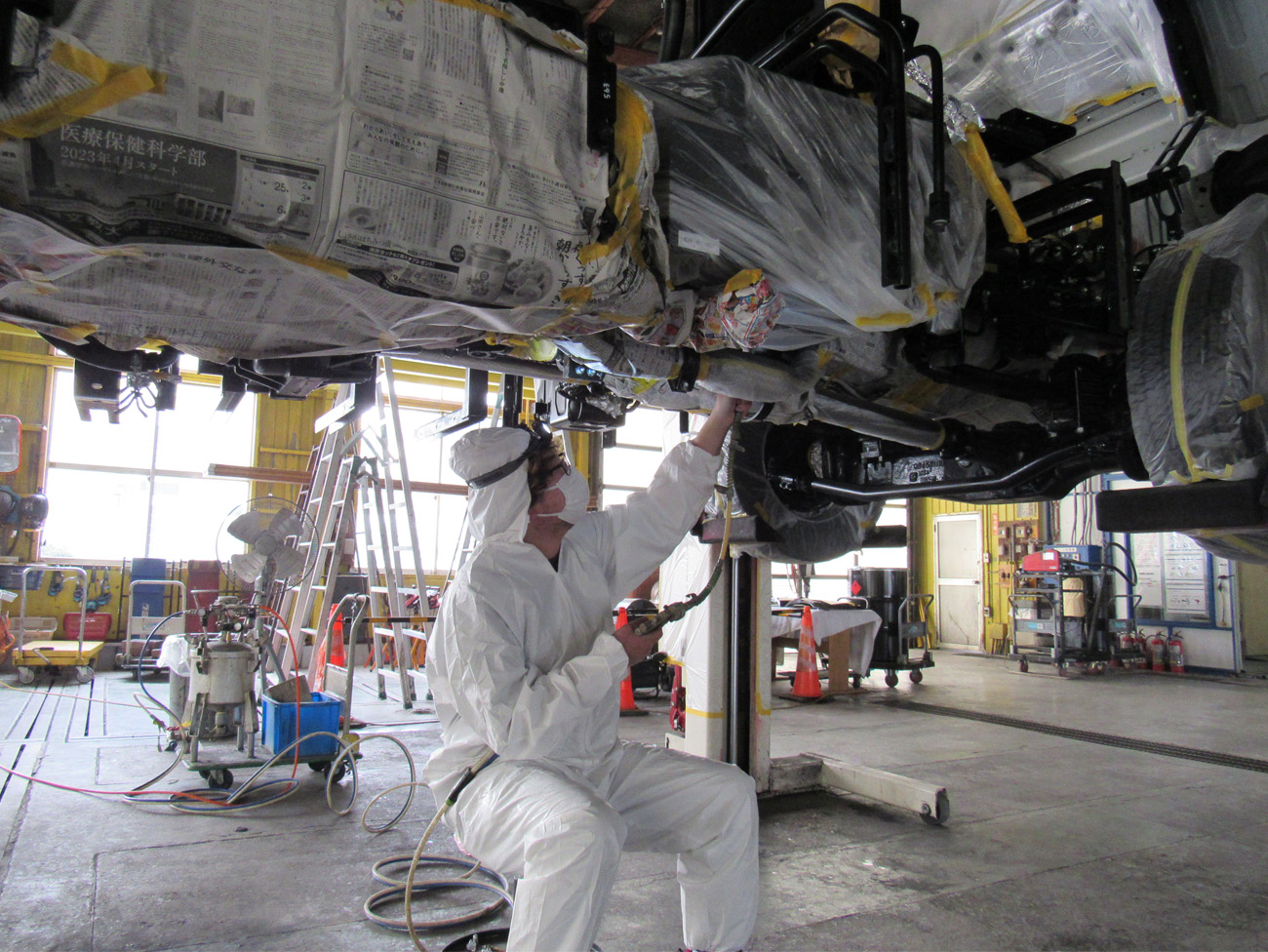 バスやトラックのさび止め加工を行っています。業務の事は先輩社員がしっかりお教えしますので、経験が無い方も充分に活躍できるお仕事です。
