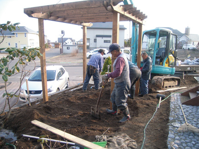 土をならしたり、資材を押さえたり簡単な作業から始めます。自分の作業が形になる仕事です。