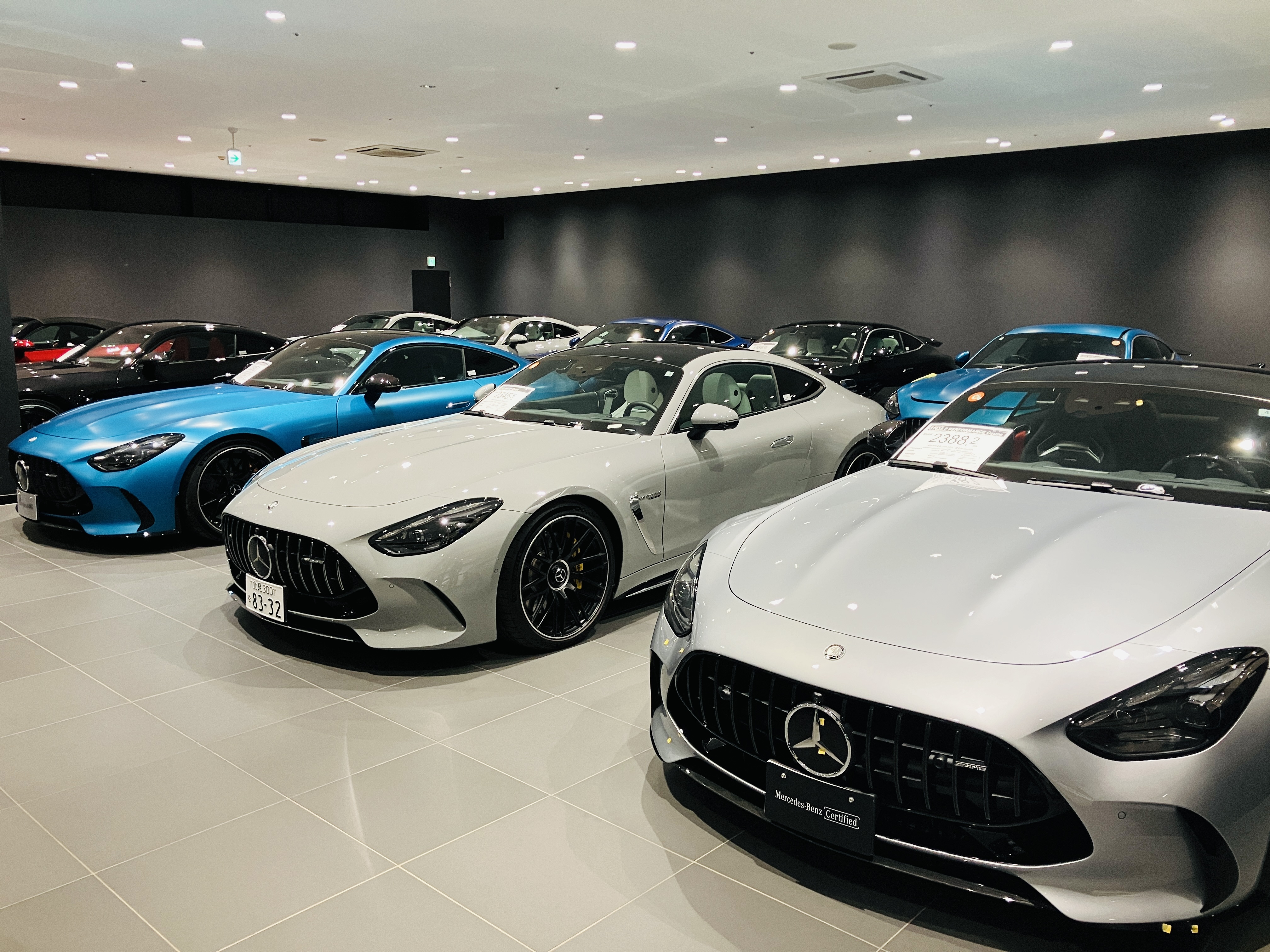 <メルセデス・ベンツの名車がズラリ>ショールームには、お客様のニーズに叶う多くのメルセデス・ベンツを展示しています。その数は新車・認定中古車あわせて常時100台以上です。