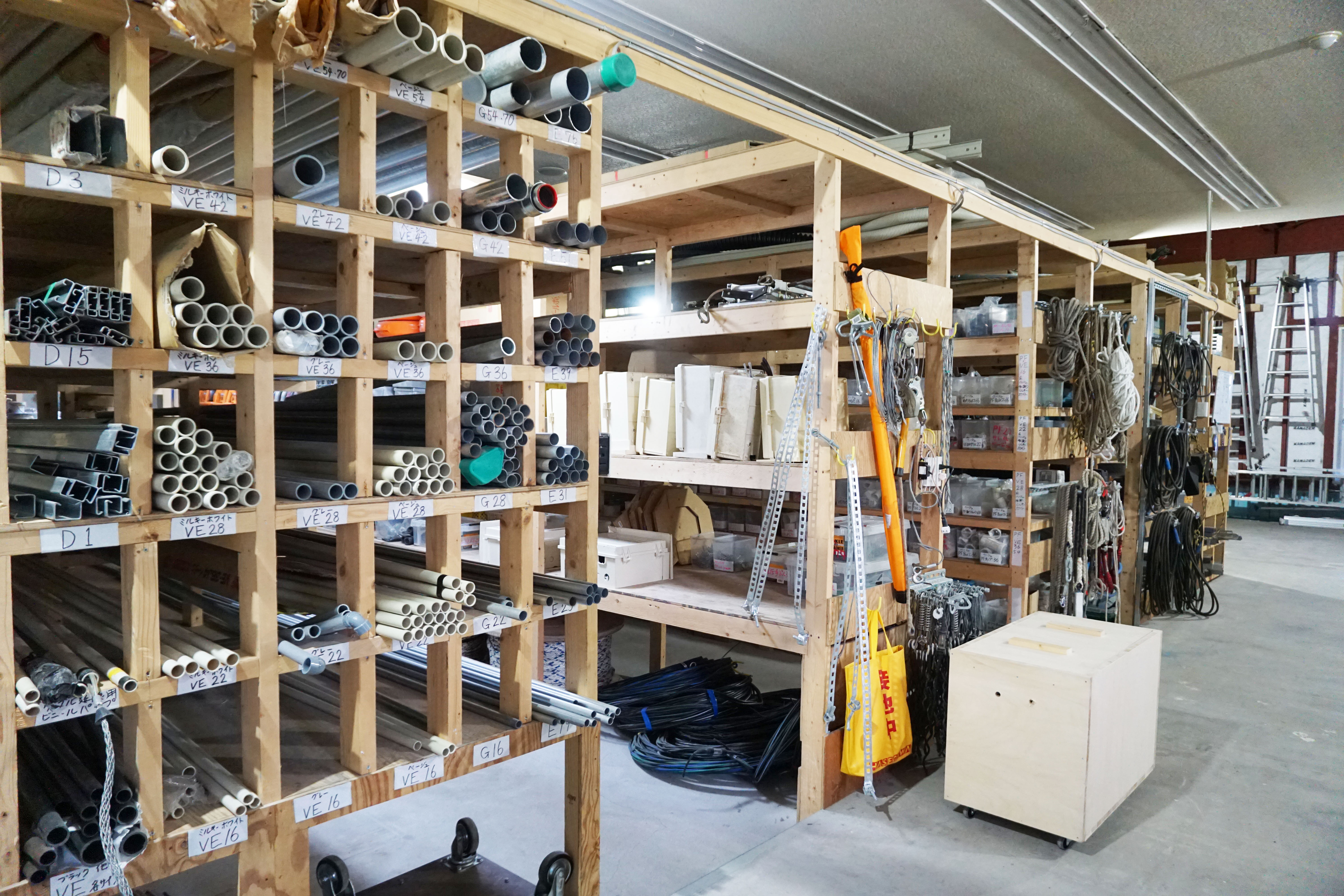 こちらは、事務所内の倉庫です。 道具は使いやすいように定位置を決めて管理しています。